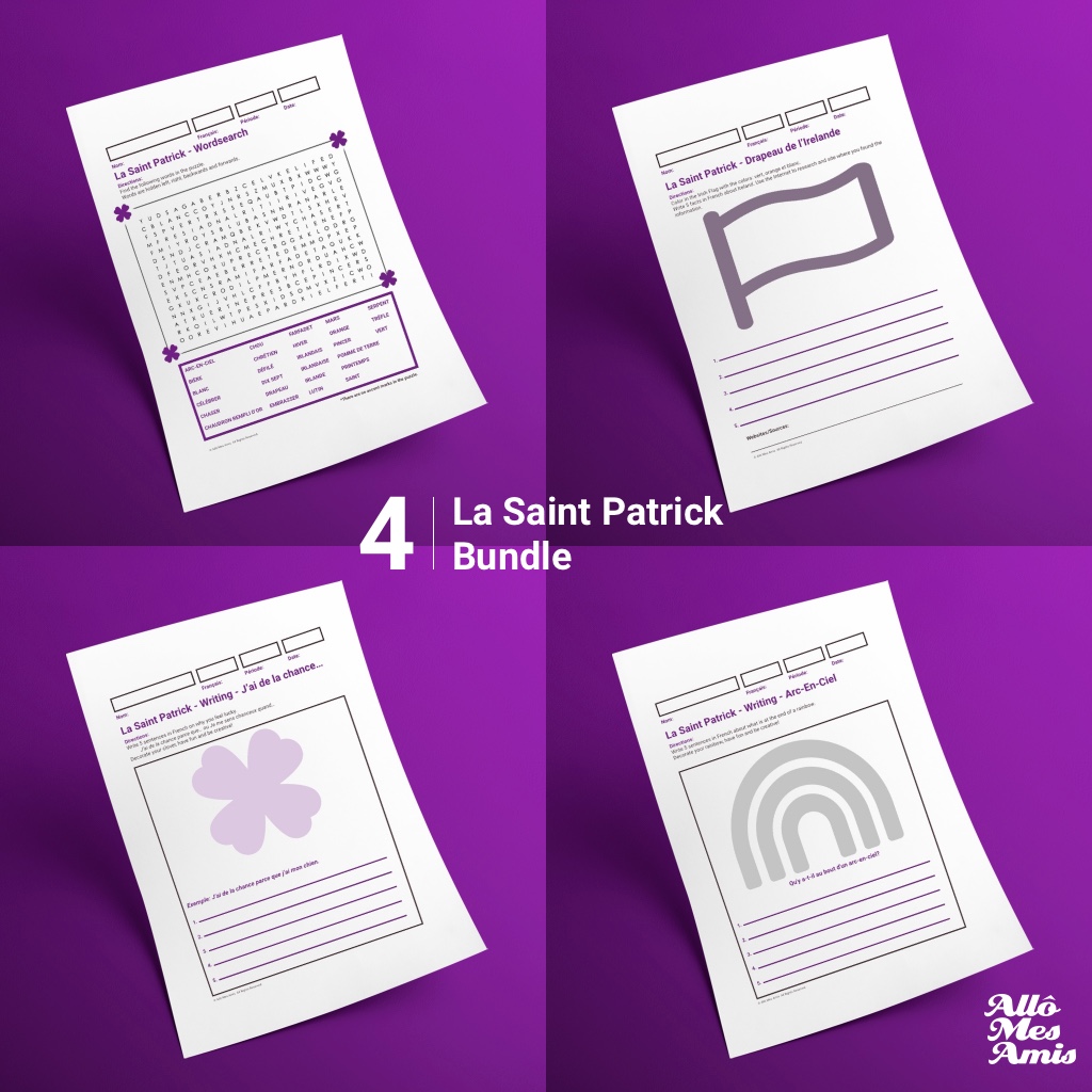 All you need are the printed activity sheets, a writing utensil and some art supplies for students. This is a fun way to celebrate Saint Patrick’s Day in French.